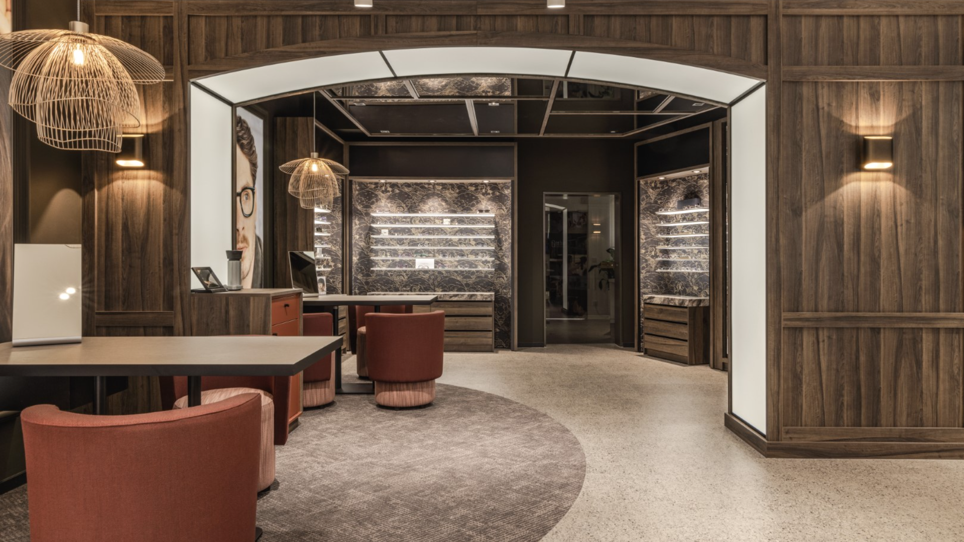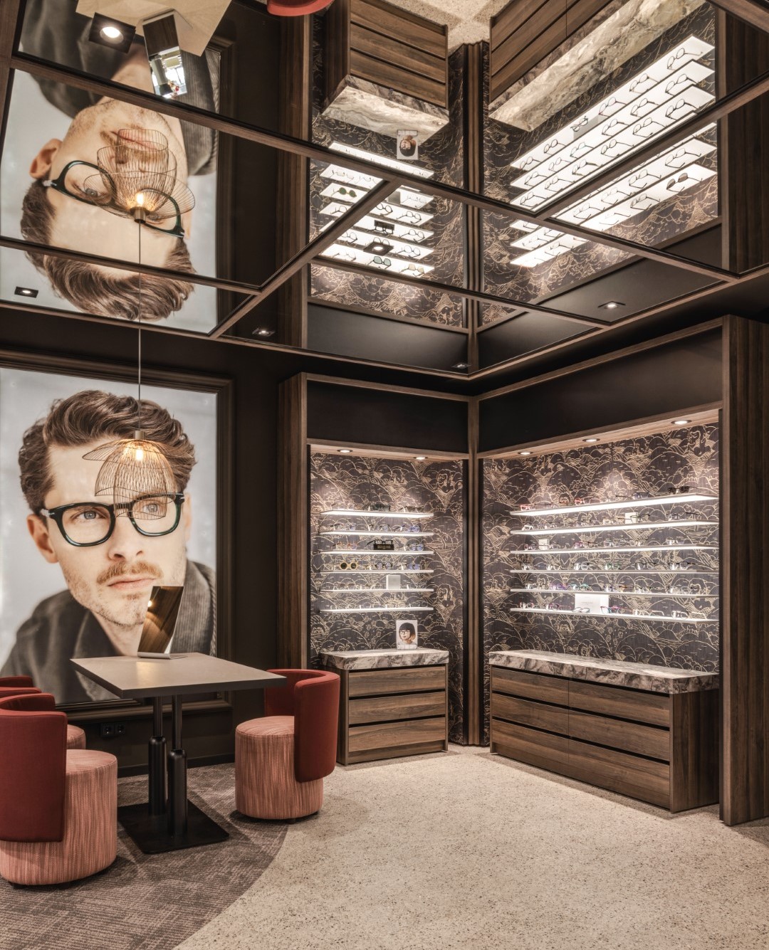 In einem fließenden Übergang gelangen wir zum zweiten Teil des Ladens, der durch pure Eleganz besticht. Dunkles Holz kombiniert mit Marmor und stilvoller Arte-Tapete bilden die Basis für wunderschön gestaltete Brillenpräsentationen. Die Brillen werden auf hochwertigen Regalen präsentiert, die beidseitig mit LED-Beleuchtung ausgestattet sind. Das Ergebnis ist eine perfekt hervorgehobene Sammlung. Auf der Rückseite vervollständigen eine Spiegeldecke und ein indirekt beleuchteter Bogen diese Luxusecke.