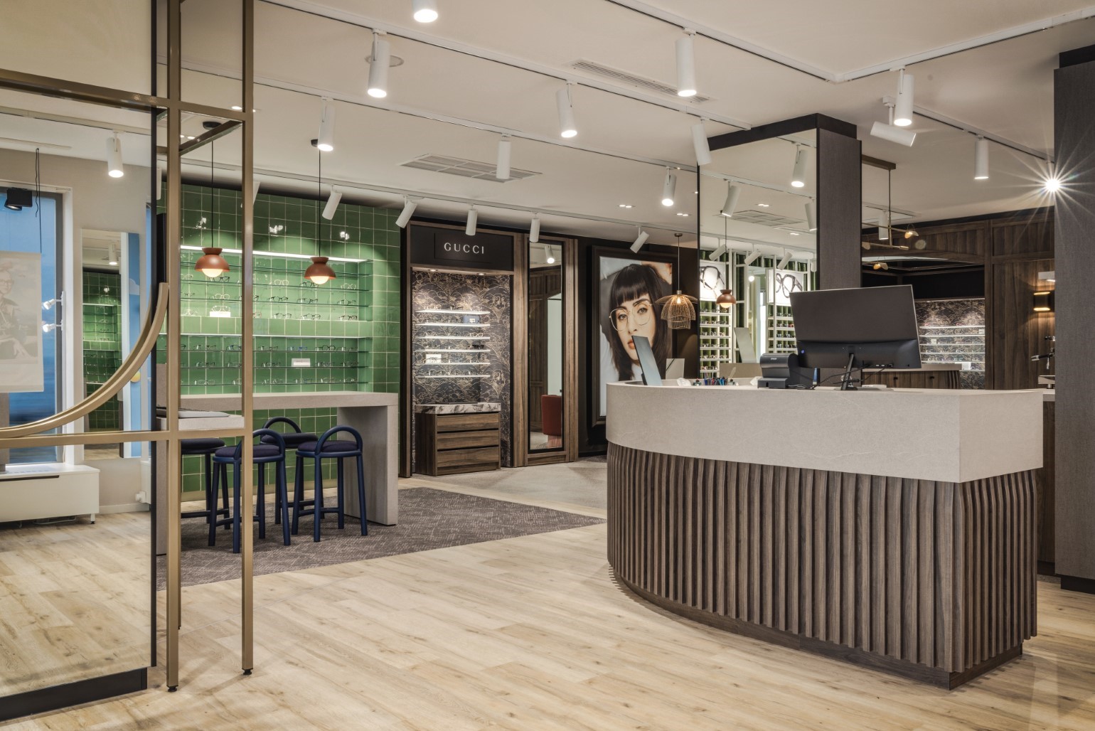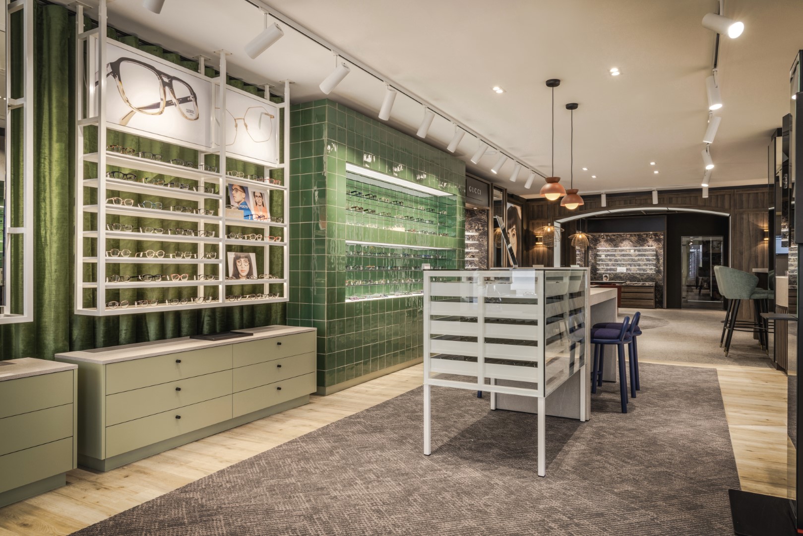 Im vorderen Bereich des Ladens haben wir ein zeitgemäßes Storedesign geschaffen. Die leuchtenden Farben und die grün gekachelte Präsentationswand ziehen schnell die Aufmerksamkeit des Kunden auf sich. Dadurch entsteht eine moderne, einladende Atmosphäre, die die Qualität der Brillen hervorhebt und Kunden in den Laden lockt. Angrenzend an den Barbereich befindet sich die runde Arbeitsplatte für Beratung und guten Service.