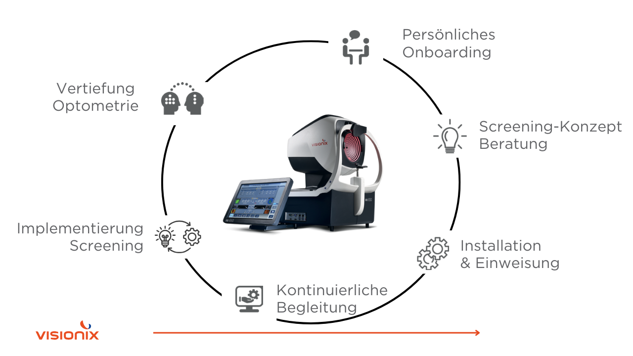 Ein modernes Screening-Instrument allein schafft noch keinen Mehrwert. Entscheidend ist das Zusammenspiel von Technik, Team, Prozessen und Kundenkommunikation. Visionix setzt daher auf ein strukturiertes, mehrstufiges Onboarding – von der Konzeptberatung bis zur kontinuierlichen Begleitung.