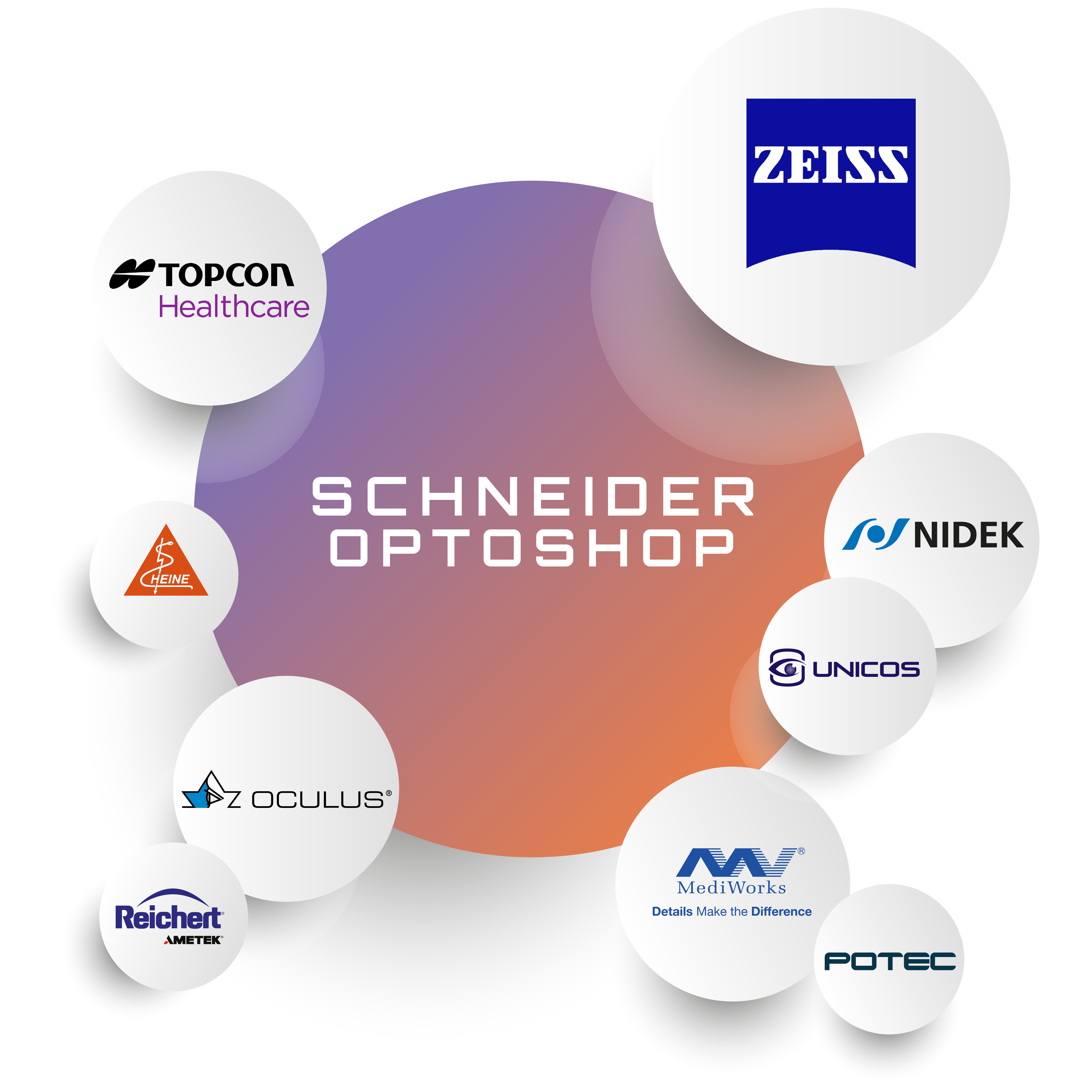 Bei Schneider Optoshop finden Sie alle führenden Hersteller unter einem Dach – von Topcon, Oculus und Nidek über Mediworks, Potec, Heine, Reichert und Unicos bis hin zu unserem neuesten Partner Zeiss. So erhalten Sie stets die beste Auswahl für Ihr Geschäft oder Ihre Praxis.