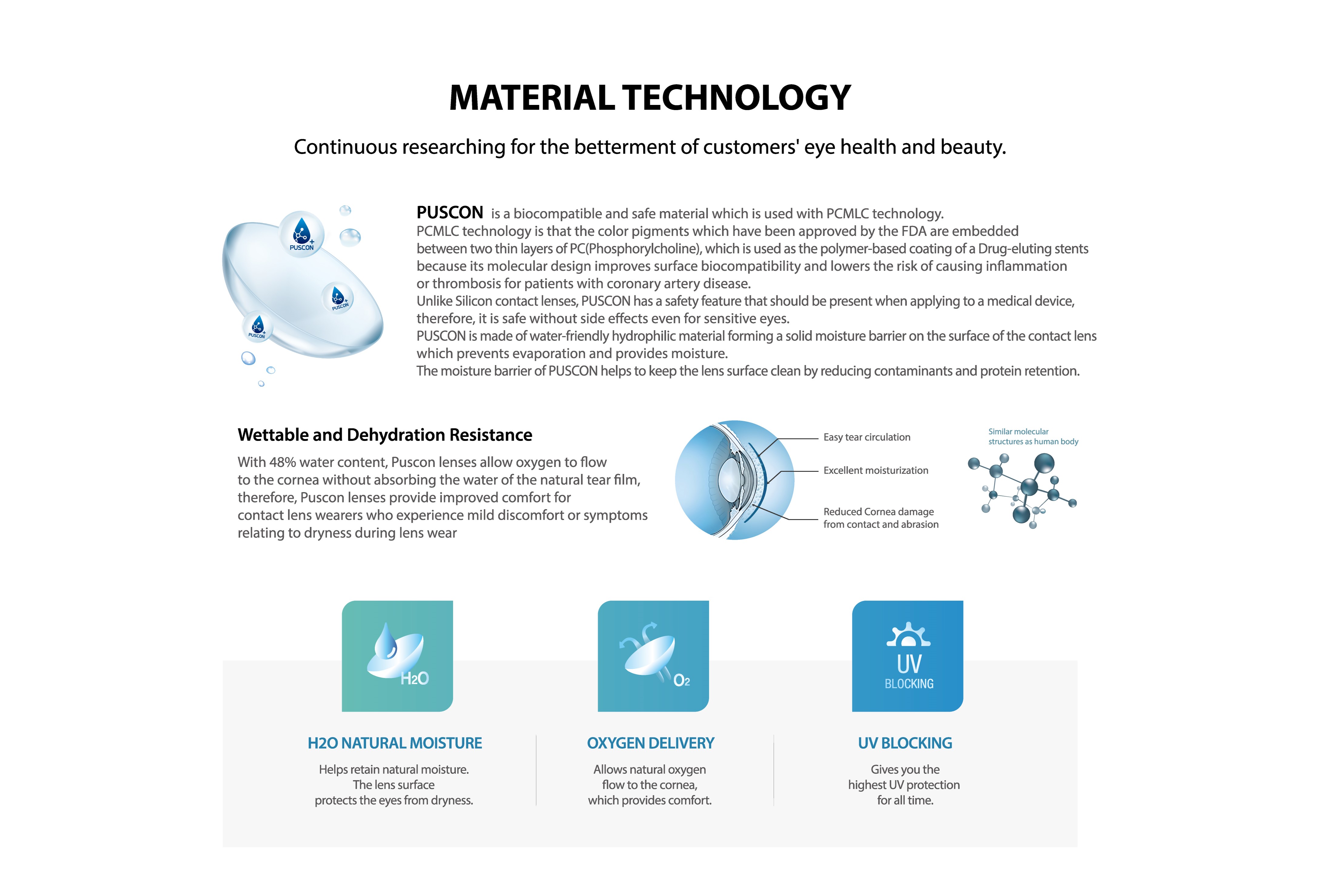 PUSCON is a biocompatible and safe material which is used with PCMLC technology. PUSCON is made of water-friendly hydrophilic forming a solid moisture barrier on the surface of the contact lens which prevents evaporation and provides moisture.